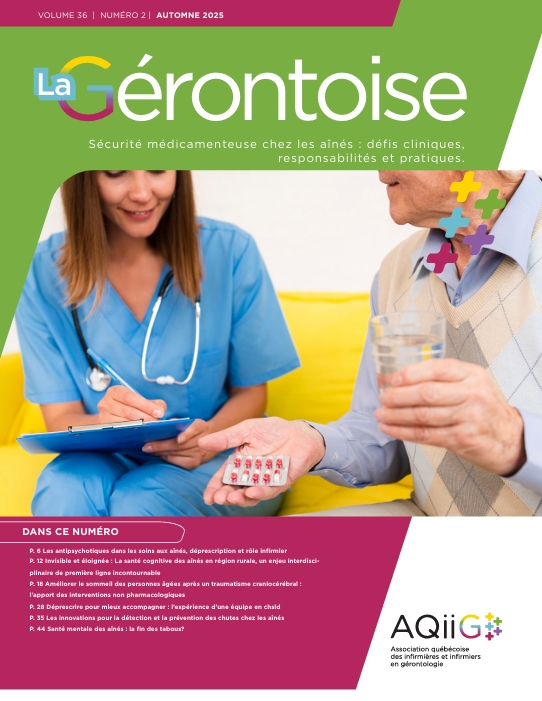 Connaissez-vous notre revue La Gérontoise? La Gérontoise publie des articles sur des thèmes cliniques, de gestion, de formation ou de recherche portant sur les personnes âgées ainsi que sur le développement professionnel infirmier. Ces articles exclusifs sont soumis à une évaluation scientifique.